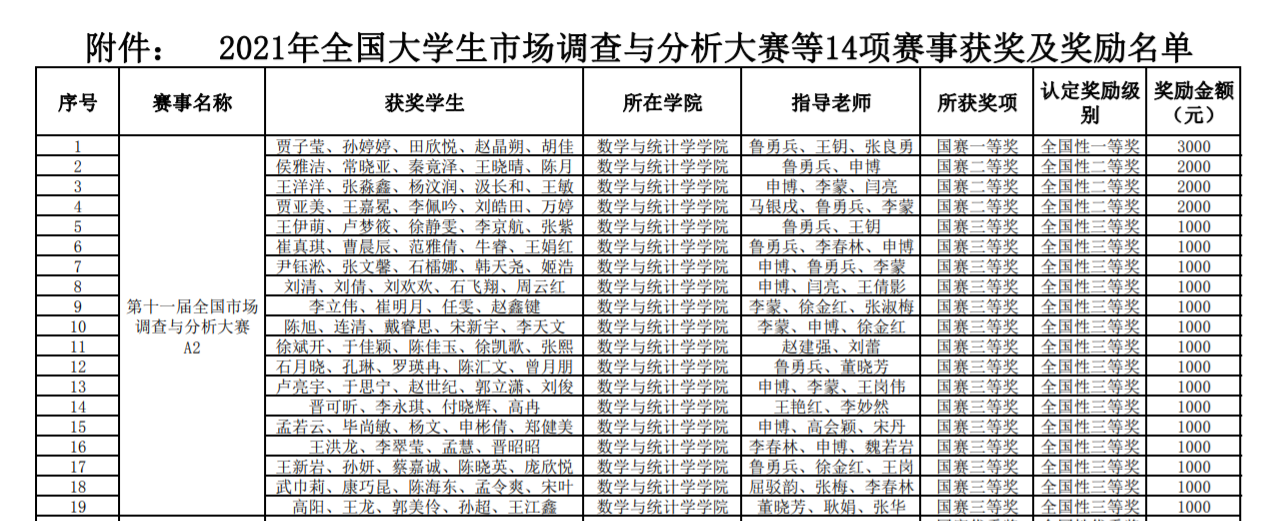 近日,教务处发布了《tyc33455cc太阳成集团关于表彰2021年全国市场调查与分析大赛等14项赛事获奖学生及指导教师的决定》,其中我院在第十一届全国市场调查与分析大赛中获得佳绩,获奖项目共计19项,其中包括国赛一等奖1项,国赛二等奖3项,国赛三等奖15项。
