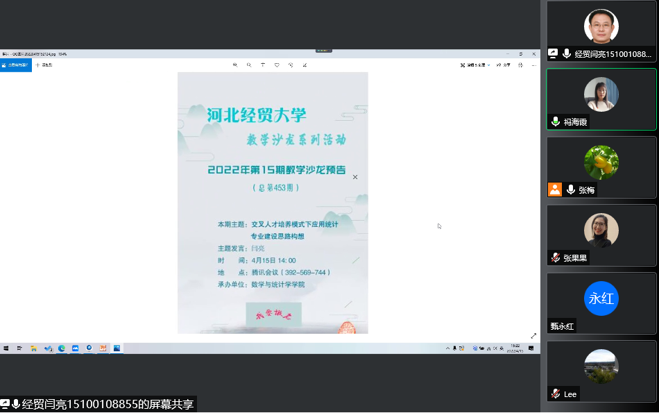 4月15日,由教学评估与教师教学发展中心主办,数学与统计学学院承办的本年度第15期教学沙龙顺利举行。数统学院副院长闫亮作“交叉人才培养模式下应用统计专业建设思路构想”线上分享交流,学院领导班子、统计学类专业教师等20人参加。