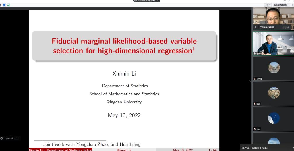 5月13日上午,数学与统计学学院邀请青岛大学数学与统计学院副院长,青岛大学统计与数据分析研究中心主任李新民教授在线作题为“Fiducial marginal likelihood-based variable selection for high-dimensional regression”的学术报告。报告由数学与统计学学院副院长闫亮主持,学院主要领导、多名教师和研究生参加。