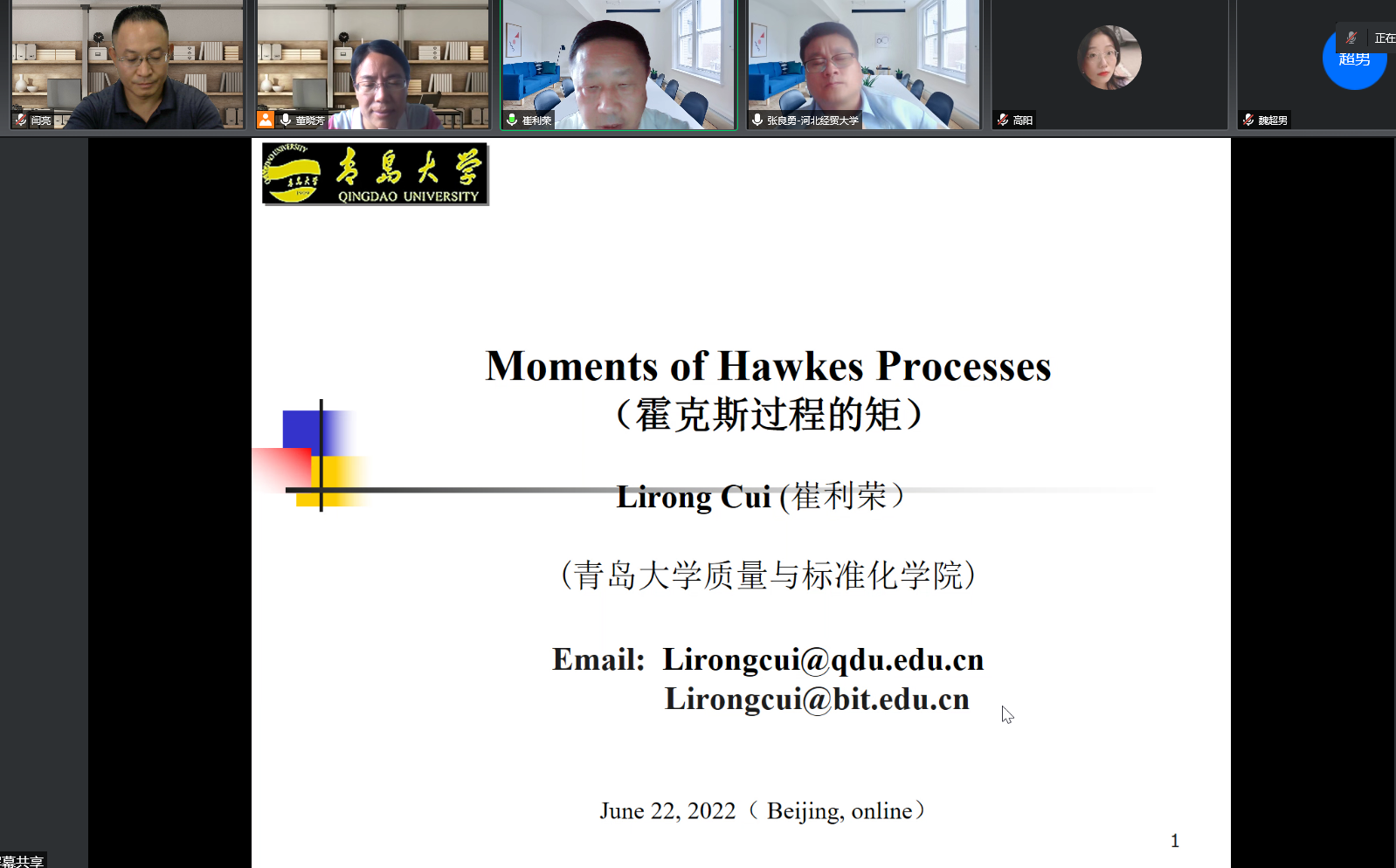 6月22日下午,青岛大学质量与标准化学院崔利荣教授应数统学院邀请在腾讯会议平台为我校师生作题为“霍克斯过程的矩(Moments of Hawkes Processes)”的学术报告。报告由数统学院副院长闫亮主持,三十余名师生聆听。